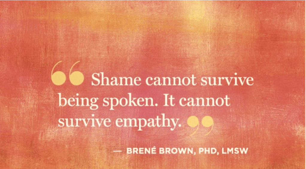 And in true A+ therapist fashion we started to dig my shame out from the back of the closet where it’s been buried for awhile and began to dust the cobwebs off of it. It has not been a fun process, but in giving voice to my shame and looking my shame in the face, it has made it not feel so big, so overwhelming, and so scary. If you have some shame hiding in the depths of your soul closet, maybe try bringing it out, dusting it off, and sitting with it for a while. Try giving a voice to your shame and speaking its name. Shame thrives in the darkness, but it doesn’t survive the light.