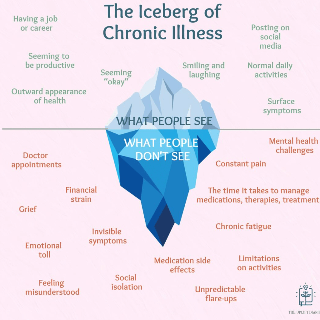 A+ brought up the fact that there’s something called the Chronic Illness Iceberg that consists of what people can see on the surface of the iceberg vs. what they can’t see on the part of the iceberg that is below the water. People see one part of the iceberg and assume that’s the only part that exists. I have included an image of the Chronic Illness Iceberg below that gives perspective on just how much is going on beneath the surface for someone dealing with chronic illness and most of these things you will never see outward signs of. This image is a general image of what those with chronic illness go through/feel each day and in no way speaks to the lived experiences of each individual with chronic illness. I relate/identify with many of the things on this image and there are some I don’t, but I feel like the image gives a good visual picture of the daily struggles those of us with chronic illness deal with.